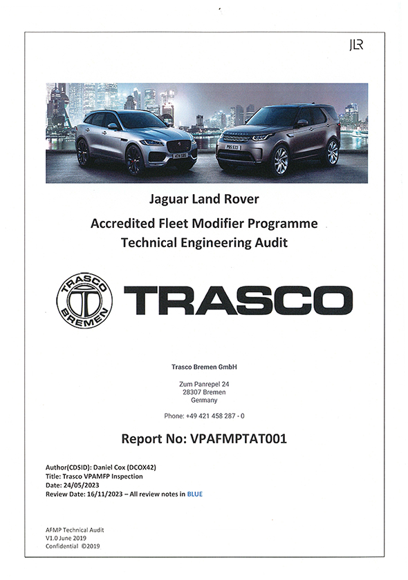 We are proud to announce that Trasco Bremen GmbH has successfully completed the latest Technical Engineering Audit as part of the prestigious Jaguar Land Rover Accredited Fleet Modifier Programme.